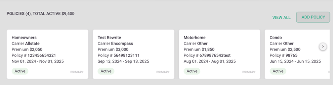 Example: A personal auto policy for a client should show an effective date and 'New' status.